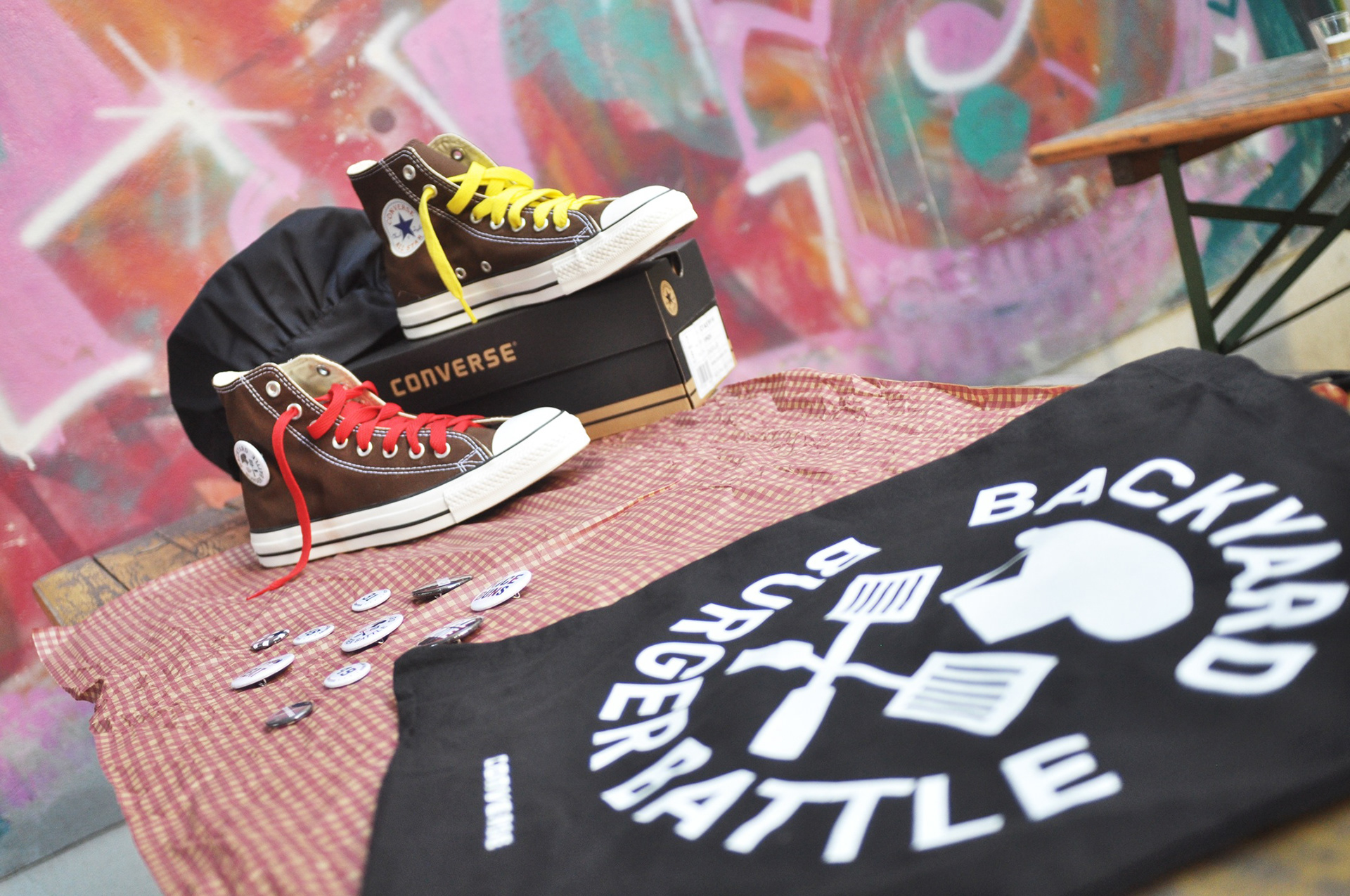 event support: key influencers give-away package: brown chucks with "ketchup" and "mustard" laces, custom Burger Battle tote bag, chef hat and various pins